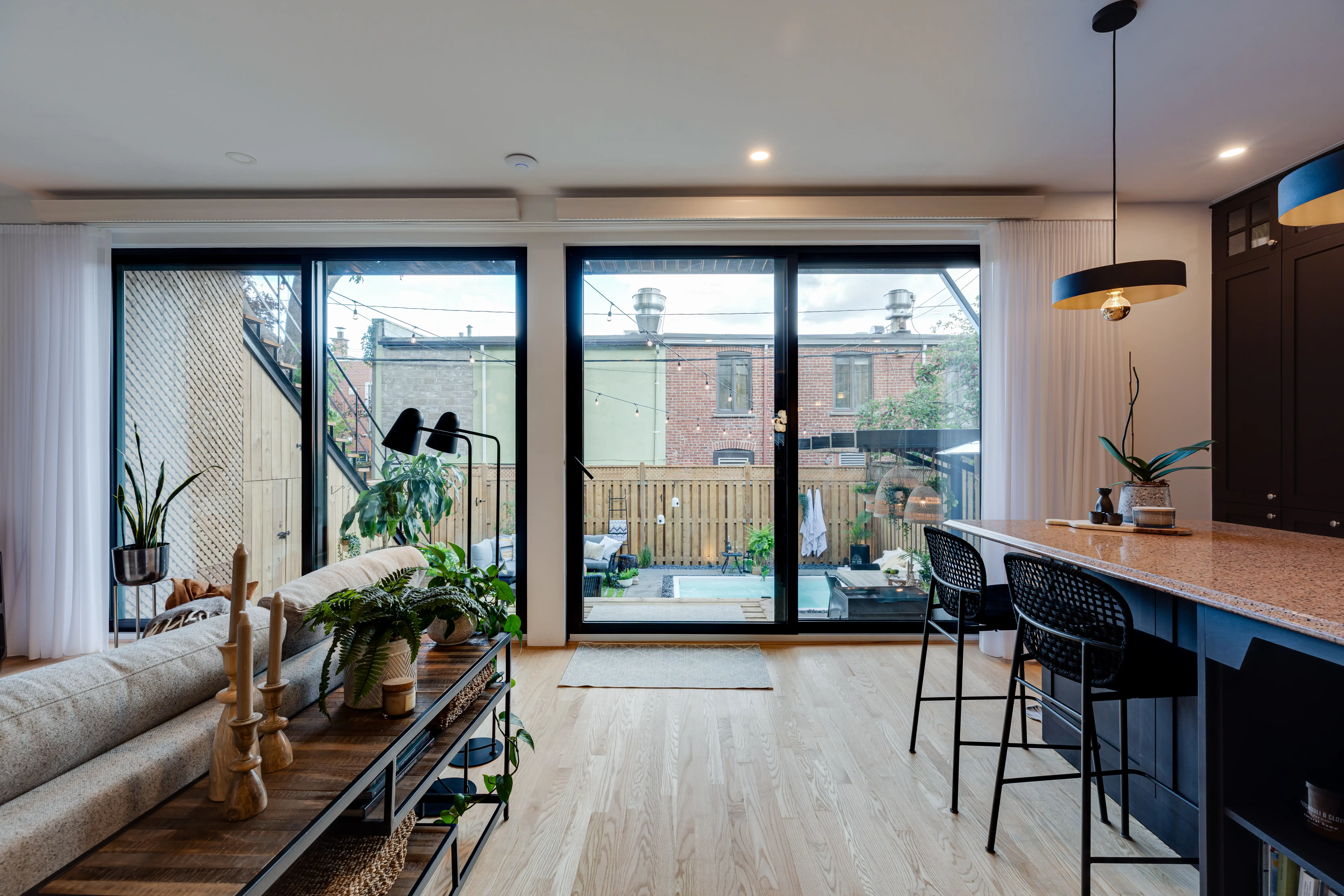 A bright renovation with the installation of two French doors in the back leading to an intimate and modern yard.